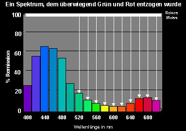 Diese Farbe sieht grün aus, weil ihr Blau und Rot fehlen. Die flankierenden blauen Stummel links und roten Stummel rechts tragen wieder zu einer "Verweißlichung" oder Minderung der Sättigung bei. In der Tat würde eine Beimengung von Weiß, z.B. einem Weißlack, falls es sich um einen grünen Lack handelt, zu einer Anhebung der gesamten Remissionskurve führen. Die Beimengung von Schwarz würde alle Säulen nach unten drücken. Insoweit scheint alles ganz einfach. |
