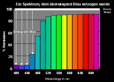 Jetzt kommt "Subtraktion" ins Spiel! Der Mangel macht den Reiz! Irgendein Farbmittel hat die längerwelligen Spektralbereiche zum größten Teil absobiert oder subtrahiert. Im verbleibenden Rest überwiegen die blauen Anteile. Tatsächlich wurde diese "R-Kurve" (wie die Farbmetriker sagen) an einer blauen Probe gemessen. Die nicht blauen Anteile - Grün, Gelb, Rot - bewirken eine gewisse "Verweißlichung" dieses Blau, weil es mit "falschen" nicht zum Blau gehörigen Lichtanteilen "verschmuddelt" wurde. |