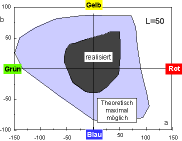 Hier das Ergebnis: Gezeigt ist ein Querschnitt durch den CIELAB-Raum bei der Helligkeit L=50. In Innern dieses Querschnitts durch den maximalen Farbraum ist der Raum eingezeichnet, den man mit Pigmenten lacktechnisch ("Ölfarben") erreichen kann. L. Gall, "farbe + lack" 11/1992 S. 863 - 869 |