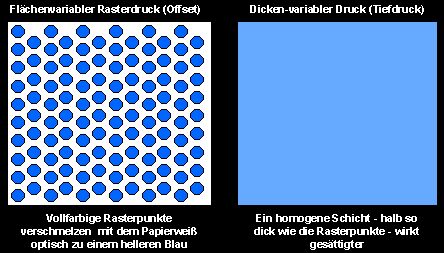 So unterscheidet sich der Tiefdruck vom Offsetdruck. Im Tiefdruck wird Buntheit und Helligkeit (Farbtiefe) durch Variation der Schichtdicke, im Offsetdruck durch Variation der Besetzungsdichte einer Fläche mit gleich farbstarken Punkten erreicht. Deshalb ist das Tiefdruckverfahren dem Raster-Offsetverfahren in der Wiedergabe von Farben prinzipiell überlegen. Um zu gleichen Resultaten zu gelangen, was von den Werbeagenturen gewünscht wird, muss man das Qualitätsniveau des Tiefdrucks letztlich durch Verschwärzlichung dem Offsetniveau anpassen! | |