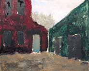 Den Fond von Backsteinen und Dachziegeln male ich dunkelgrün